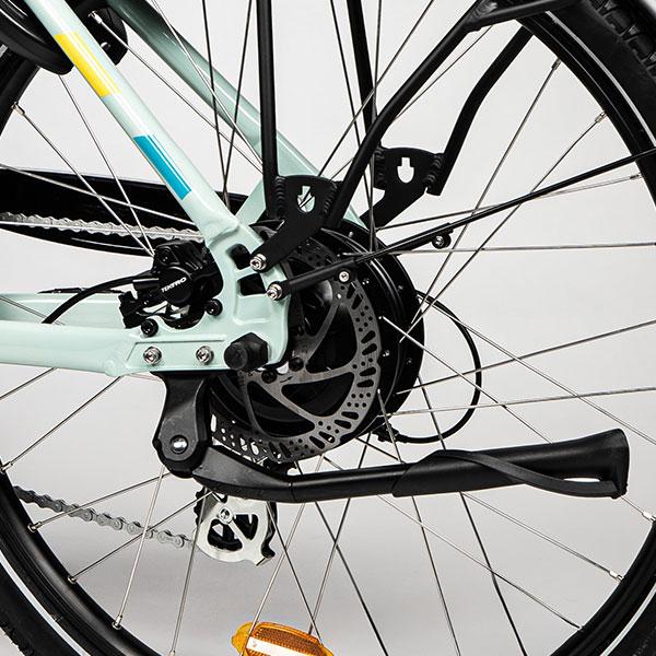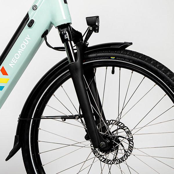 C'est un modèle de ville robuste et confortable, parfait pour les trajets du quotidien. Il est équipé d'une fourche suspendue. Le moteur dans la roue arrière apporte puissance et sensation de propulsion.
