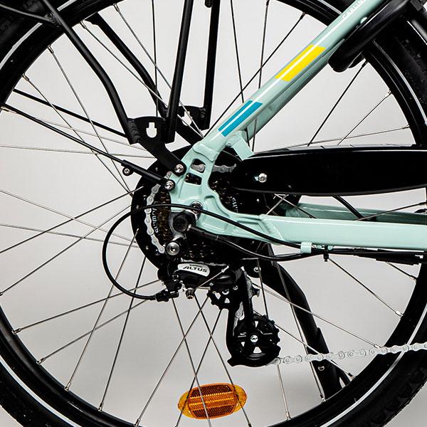 C'est un modèle de ville robuste et confortable, parfait pour les trajets du quotidien. Il est équipé d'une fourche suspendue. Le moteur dans la roue arrière apporte puissance et sensation de propulsion.