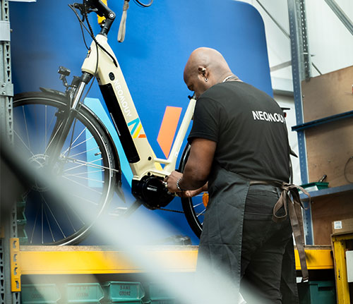 Notre premier enjeu est de développer des vélos durables. Tous nos vélos sont garantis 2 ans, les cadres, eux, sont garantis 5 ans. Notre réseau de distributeurs professionnels agréés assure l'entretien et le service après-vente de notre marque, quel que soit l’endroit où vous avez acheté votre vélo. Notre équipe de techniciens située à La Flèche les accompagne dans leur diagnostic et la réparation. NEOMOUV dispose d’un stock important de pièces détachées, neuves ou reconditionnées, et met à disposition de ses distributeurs un système informatisé performant qui permet de suivre la traçabilité de chaque vélo et de connaître en temps réel la nomenclature des composants. Ceux-ci sont ainsi en mesure de réparer des vélos de plus de 10 ans. Nous avons également des partenariats avec des acteurs du reconditionnement.